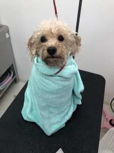 タオルを巻いてる写真は可愛すぎて、撮っちゃいました笑こういう姿が見れるのはトリマーの特権ですね。写真慣れしているあるもにちゃん、最後は首を傾げてニッコリ?